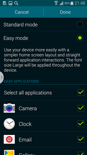 وضعیت Emergency Mode نیز کاری شبیه به Ultra Power Saving انجام می دهد و با سیاه و سفید کردن صفحه و محدود کردن دسترسی به بخش زیادی از اپلیکیشن ها کمک شایانی در کاهش مصرف انرژی انجام می دهد. قابلیت مفید دیگری در گلکسی اس 5 به نام Easy Mode وجود دارد که همانطور که از نام آن پیداست سعی در آسان نمودن رابط کاربری و استفاده راحت تر از آن دارد، وقتی Easy Mode را فعال می کنید آیکون ها و المان ها در رابط کاربری بزرگتر از قبل شده و نوشته ها نیز درشت تر می گردند تا دیدن و لمس کردن آنها آسان تر شود. در این وضعیت شما می توانید هر اپلیکیشنی که دوست دارید را به لیست دلخواه اضافه کنید تا در صفحه هوم نشان داده شود.