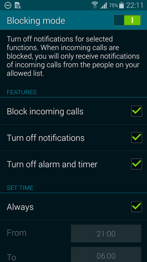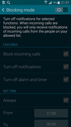 برای بخش Blocking Mode می توانید محدودیت زمانی ایجاد نموده و تنها در بازه مشخصی از آن استفاده کنید همچنین امکان بلاک کردن آلارم ها و نوتیفیکیشن ها هم وجود دارد.