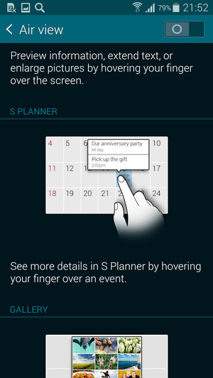 Blocking Mode نیز از دیگر امکانات از پیش تعیین شده است که با کمک آن می توانید تماسها را محدود نموده و یا جلوی نشان دادن نوتیفیکیشن ها را بگیرید یا زنگ آلارم را در زمانهای معینی قطع نمایید. قابلیت های مربوط به Air View نیز همچون گذشته وجود دارد و با فعال نمودن آن و نزدیک کردن انگشت خود به صفحه می توانید در محیط گالری و یا تقویم و ... از آن استفاده کنید. کافیست در منوی گالری انگشت خود را بر بالای یک آلبوم و بدون لمس صفحه نگه دارید تا محتویات درون آن یکجا نمایش داده شود.