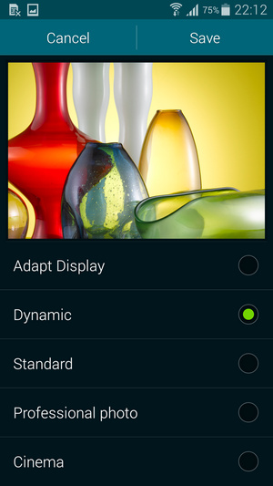 باید اعتراف کنیم گلکسی اس 5 بهترین نمایشگر حال حاضر را در میان تمامی تلفن های موجود در بازار دارد و پیش بینی هم می شود که حالا حالاها یکه تاز باقی بماند! مهمترین ایرادی که به پانل های AMOLED گرفته می شد غلطت رنگ غیر طبیعی و نمایش غلط رنگ رنگهای گرم بود اما اینبار سامسونگ حرکت جدی در تولید پانل های نمایشگر خود انجام داده است و توانسته تمامی ایرادهایی که وجود داشت را برطرف نماید. همانند پرچمداران قبلی سامسونگ شما می توانید از منوی Display در تنظیمات به راحتی میزان غلظت رنگ را از میان پروفایل های موجود انتخاب کنید.