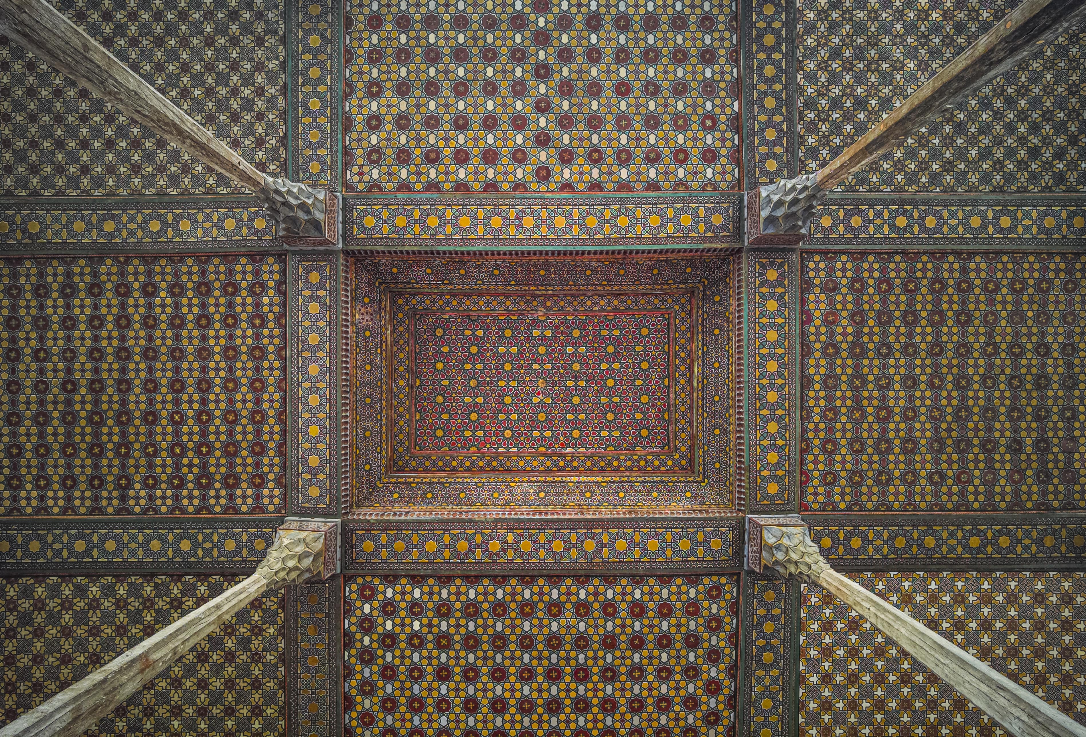 بعد از ثبت نمای میدان از ایوان عالیقاپو، سراغ سقف ایوان رفتیم. برای ثبت عکسی بدون پرسپکتیو و دارای کادری دلنشین، حتماً باید وارد حوض ایوان میشدیم و هر چند این کار ممنوع است با کمی مراعات ما و مسئولین کاخ میسر شد تا شات خاص و زیبای بالا برای شما فراهم شود. دوربین پی 40 پرو جزئیات و رنگ را به خوبی ثبت کرد و کمترین ادیتی در عکس بالا انجام شده است.
